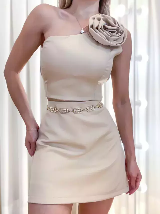 Conjunto Feminino em Alfaiataria Short Saia e Cropped Alça Única Viviane Ref. 1320