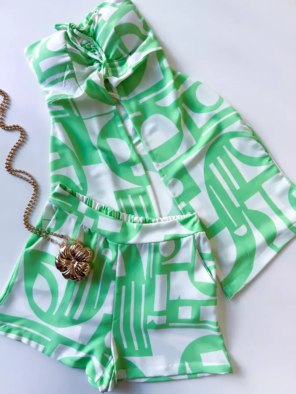 Conjunto Feminino em Crepe Blusa Bata Alongada Amarração e Short Sheila Ref. 1373