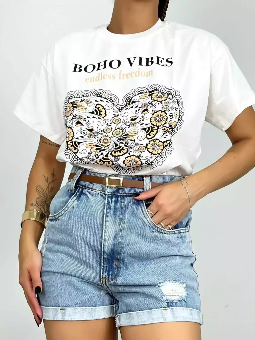 T-Shirt Feminina Estampada Boho Vibes Coração Ref. 808